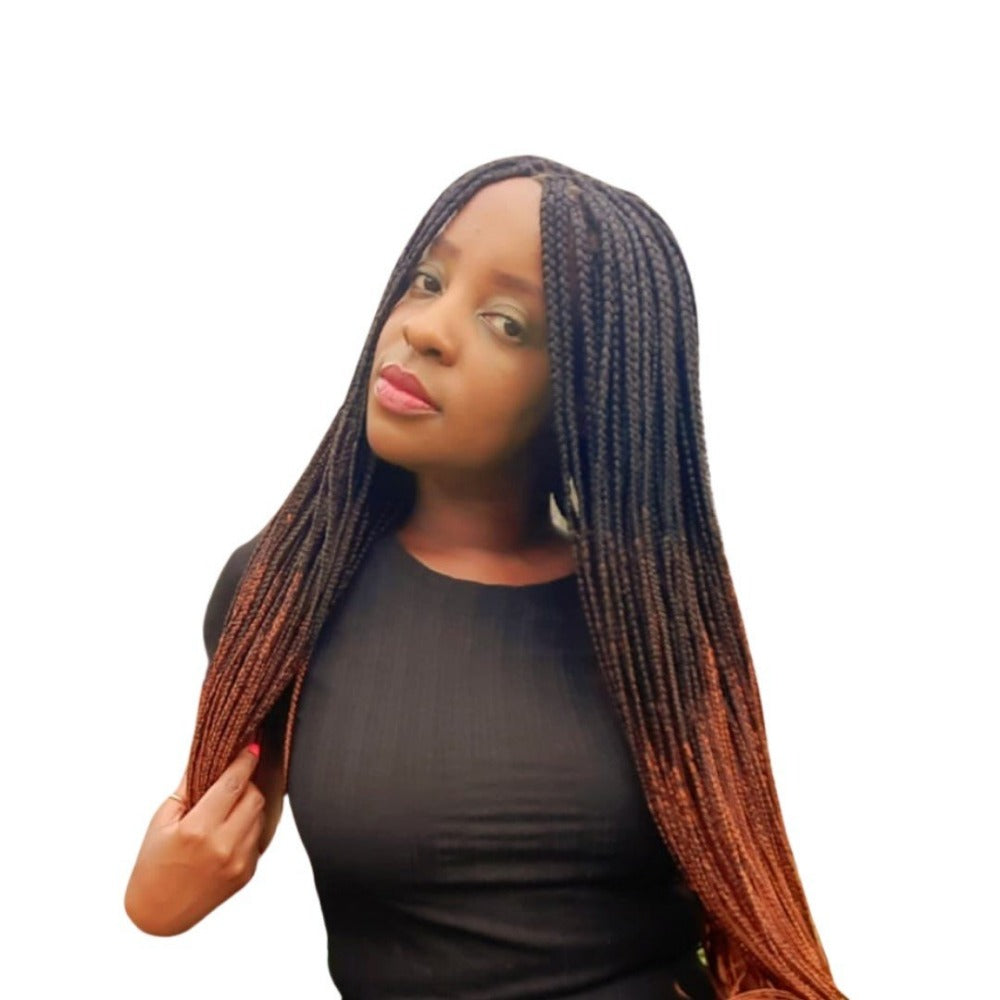 This is a lovely knotless braided wig that is made on a closure. The colours compliment each other and it looks very natural on . It is a 35 inch three-toned braided wig and is made on a standard cap size with a black band inserted at the back.